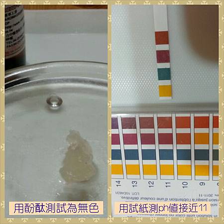 剛做好的皂糊是乳白色的,保溫10小時後發現有些變透明,保溫21小時後就已經很透明了,所以用酚酞滴幾滴在一小坨皂坨上測試為無色,代表ph值應該是在10以下,是已經可以稀釋使用了。不過,再以試紙測試時ph值為11,想到老師建議放4-6週比較好,所以決定先不要稀釋,至少再等1週後再用試紙測試,若為10以下可先溶解50g使用,剩下的再用來慢慢觀察實驗囉~