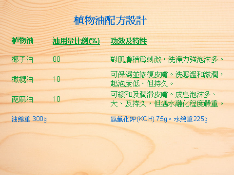 2. 為了能觀察打皂過程水分是否蒸發太多,打皂時有量秤鍋、油、鹼的重量,不過後來卻忘記要觀察水分的變化,沒有再秤一下所以不確定是否水分蒸發太多。